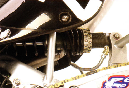 KX60 forks with heavy fork springs and travel control valve modification were added for extra travel and push action. Tubes were also hard anodized for extended oil life and cool factory look.