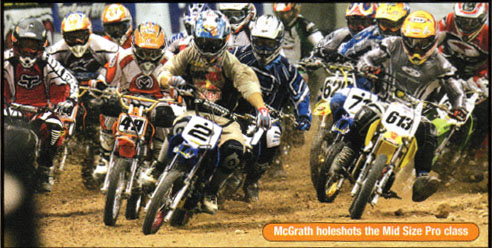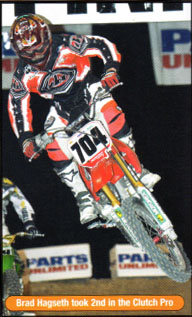 The last standard race of the night was the Clutch Pro event, where Rich Taylor took the holeshot over McGrath and yet another Arenacrosser, Brad Hagseth. Taylor lost the lead when he hit neutral in a turn, and Hagseth moved to third before Taylor could recover.