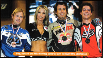 The event started out with a rider introduction starting with 1990 125cc Western Regional Supercross Champion Denny Stephenson, four-time AMA National Champion Jeff Emig, five-time National Arenacross Champion Buddy Antunez, 1982 250cc World Champion Danny LaPorte, six-time AMA National Champion Jeff Stanton, 1990 125cc National Champion Guy Cooper, and seven-time AMA Supercross Champion and 1995 250cc National Champion Jeremy McGrath.