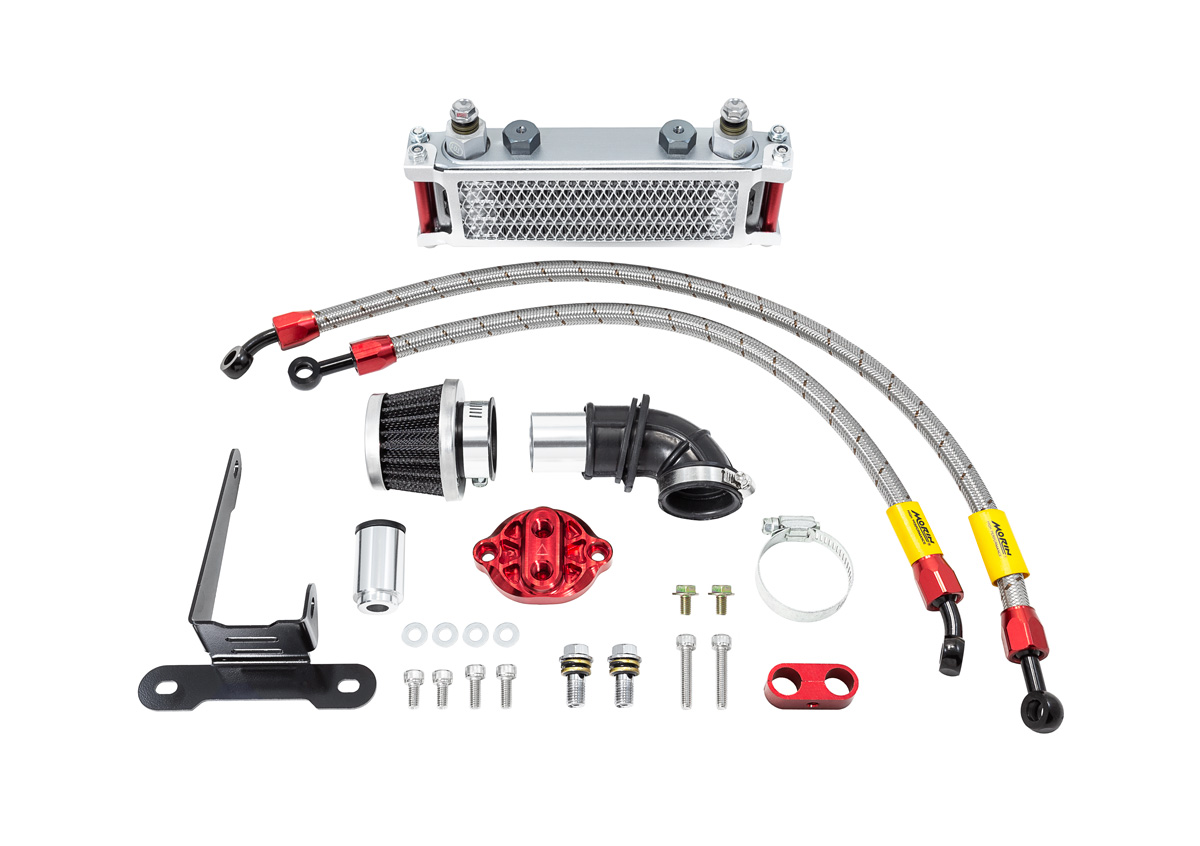 The Morin Racing Oil Cooler Kit for the Honda Monkey 125 is a high quality accessory designed to help the Honda horizontal engine run cooler. Air-cooled engines run hotter when modified (i.e. big bore kits), subjected to heavy loads, or used for racing. This kit will help the engine’s durability and reliability by circulating the engine oil through a cooler reducing the engine’s oil temperature. The kit includes the following: