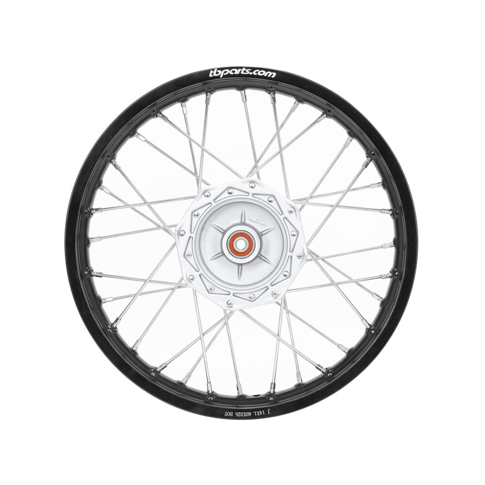 After seeing many aggressive riders tear apart KLX110 wheels racing them on mini MX tracks, we wanted to bring a new high quality and affordable option to the market. So, our wheels come ready to run from bearings to the rim! Starting out, we had the factory install high quality NTN bearings with the proper spacer behind/between them. Next, is our OEM style “bolt in place” cast aluminum hub painted in silver to match the OEM brake panel (our TB logo is also cast in). For added strength, we used stiffer/harder Stainless Steel spokes that are weather resistant compared to the basic steel OEM spokes. Wrapping up the complete wheels, are the aircraft grade 7050 aluminum rims in satin black with the TBparts.com logo!