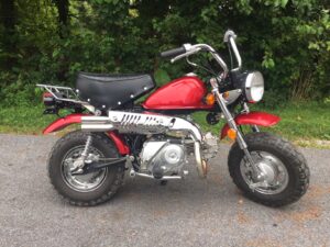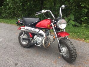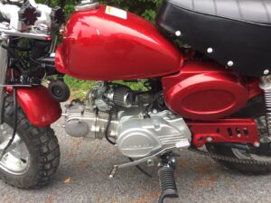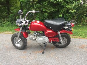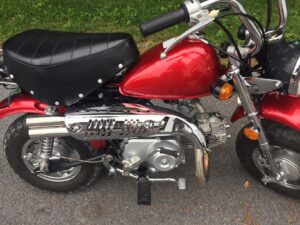 Chinese Monkey (Z50) Bike – $699.00 OBO – Maroon, 4-stroke 88cc, 145 miles. This is a Jincheng copy of the Japanese version Z50 Monkey bike with lights, horn, signals, etc. Not sure of the model year but its in overall good condition and runs great. It has one of our TB 88cc bore kits and 20mm carb kit installed on it (probably 2 miles on it since installed). Also has some type of aftermarket performance exhaust but its not loud. The horn, signals, and lights all work but it needs a new rear turn signal lens and bulb, headlight switch knob, and headlight bucket (functional but cracked). No title.